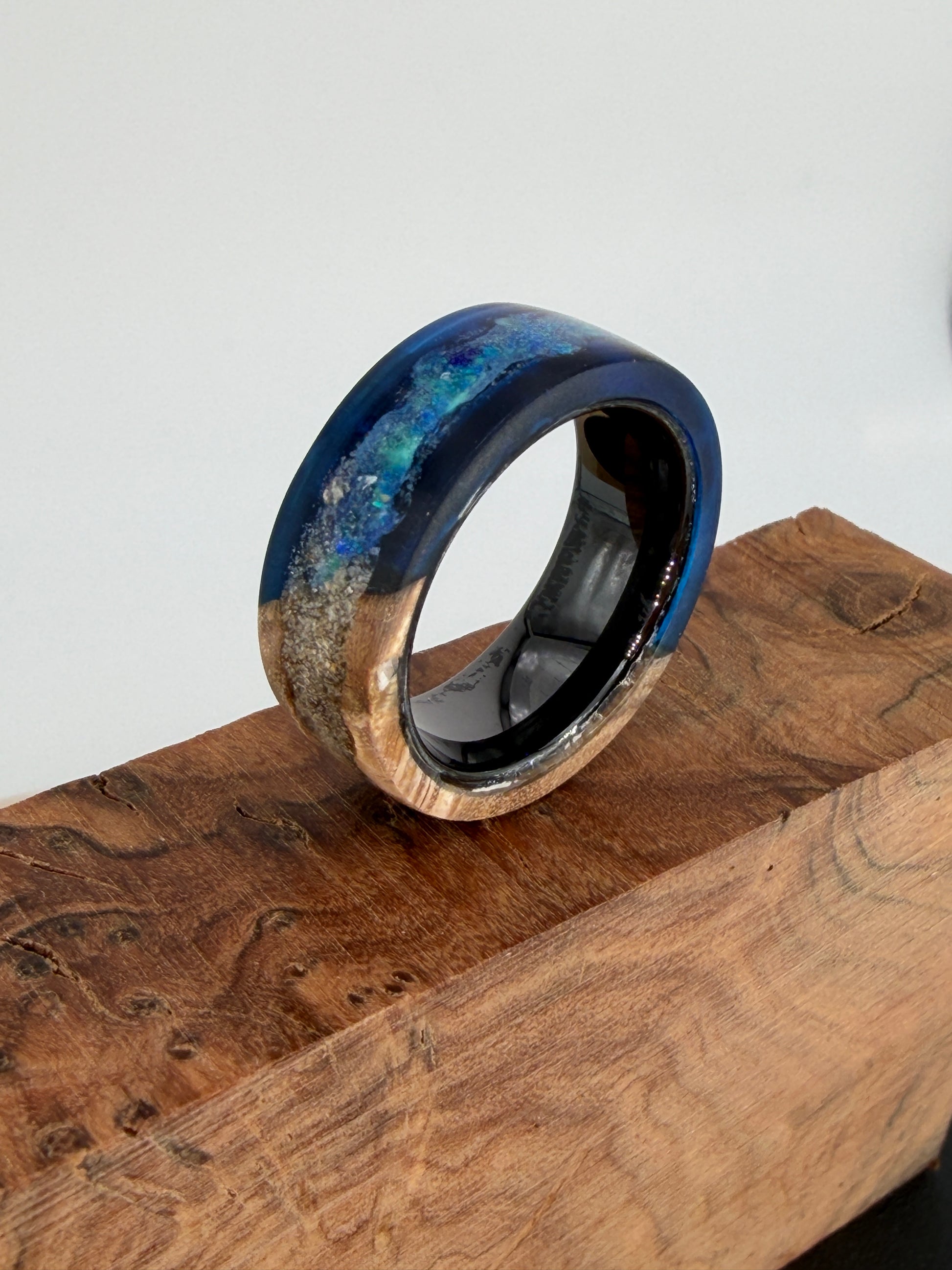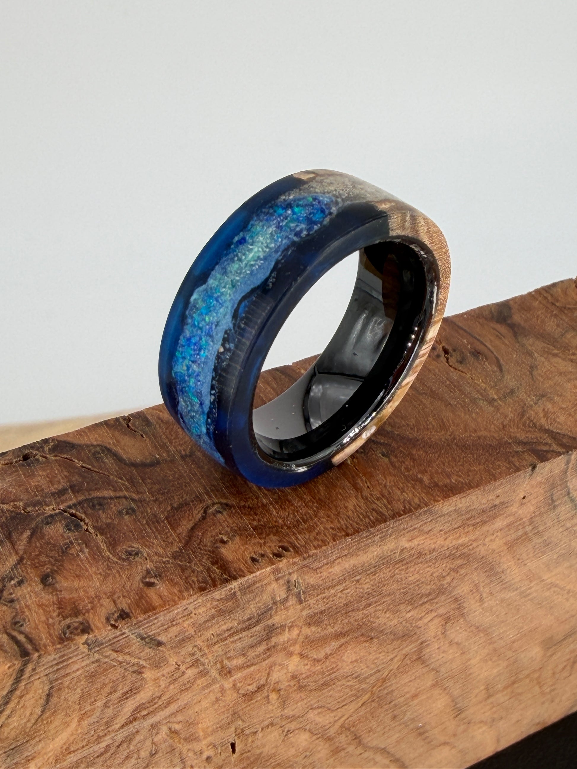 Amerikanisches Hartholz, blaues Kunstharz, blaue Opale, Leuchtpigmente, echter Strandsand, Muschelfragmente, schwarzer Keramikkern