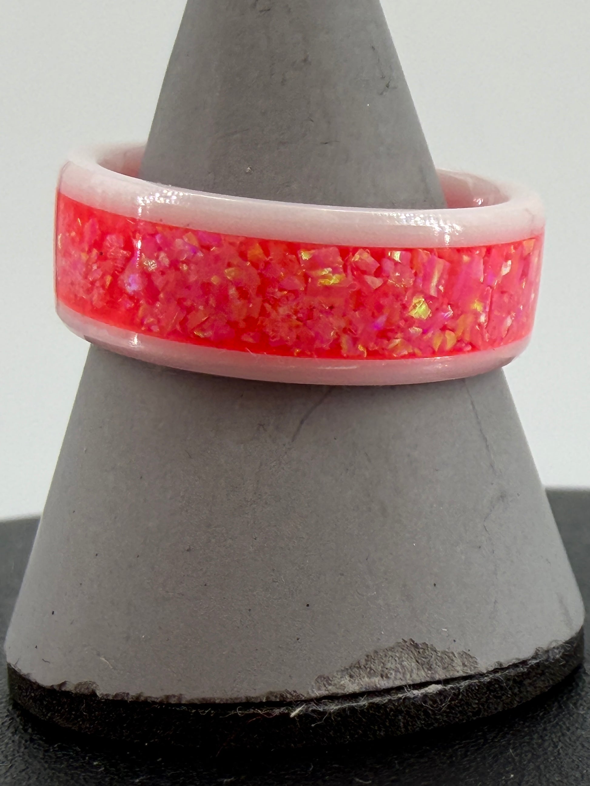 - Design: Entstanden aus einer spielerischen Idee – helle Keramik trifft auf schimmernde Opalfragmente in lebendigem Pink. Ein Ring, der Freude ausstrahlt und die Leichtigkeit des Augenblicks trägt. Keine Serie, kein Konzept – nur ein kleines Stück Farbe, das lächelt.